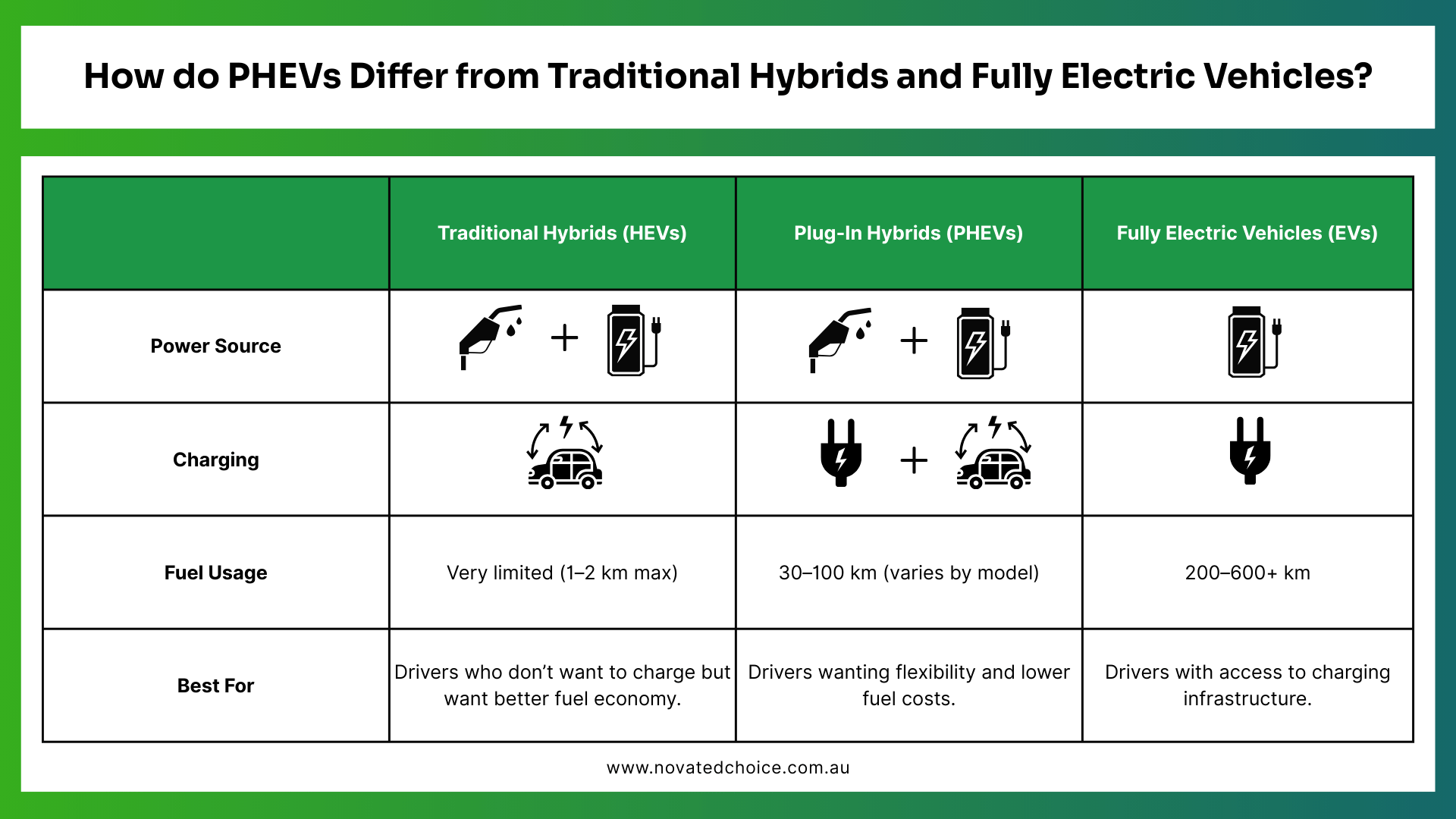 While PHEVs don’t qualify for full FBT exemptions like EVs, novated leases manage FBT through a mix of pre- and post-tax deductions. This makes it easy and cost-effective compared to traditional car ownership.